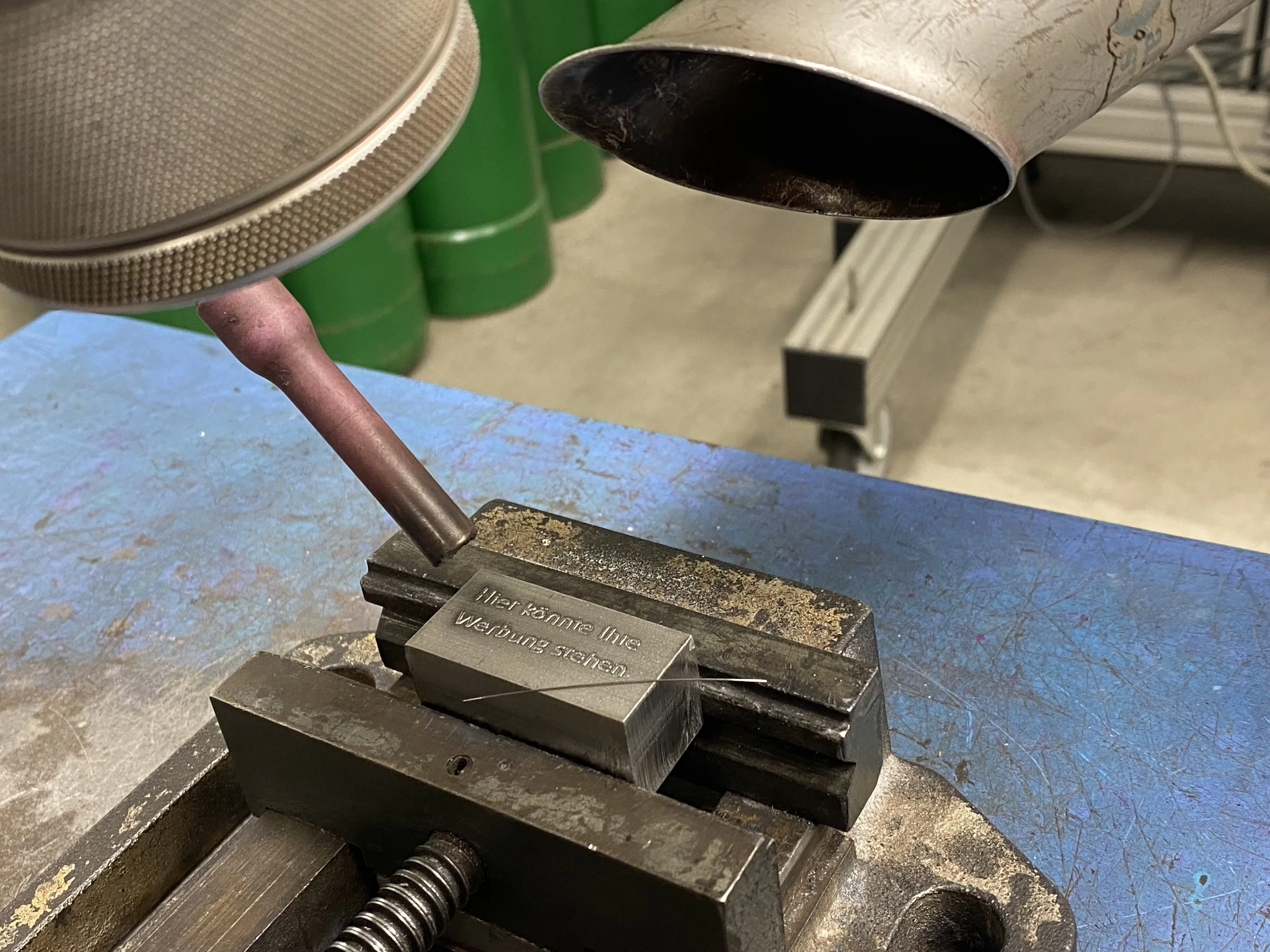 Auf diesem Foto: “Calibri” Schriftgröße 14 auf Edelstahl 1.4841.